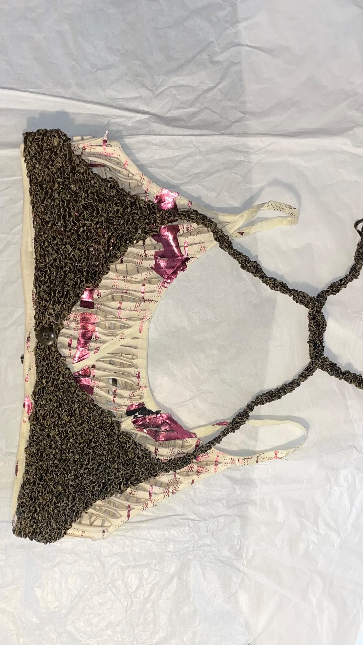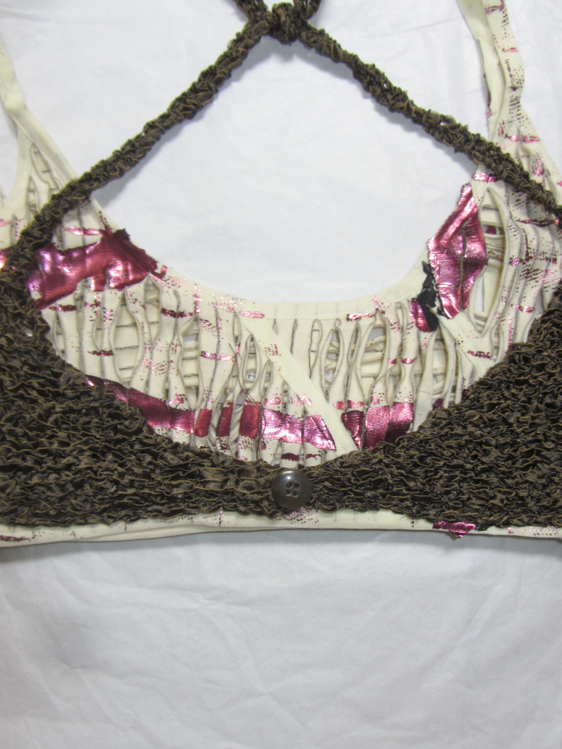 Combinación de corpiño de base vintage con bretel con regulador + corpiño de cinta de seda tejido a mano en la parte superior.